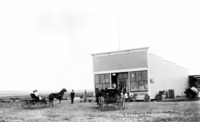 GB 015 "The Store at Amsterdam. August 17th, 1912;" a wood frame general store with two buggies, with horses, and several people standing in front of and next to building.
