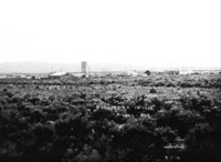 PC-2257 "Hollister in 1912;" wide view of early Hollister across a sage brush plain, showing several buildings.