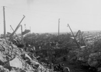 1939 Men, teams of horses, and a construction derrick in a canal channel.