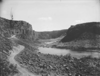 1937 Wide view of Upper Salmon Falls from creek level; rock formation in middle