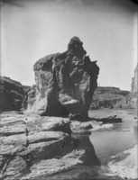 1934 Two people sit at the base of one of the large rock formations at Pillar Falls.