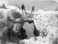 1935 Two men stand on a natural stone bridge (arch) at Shoshone Falls.