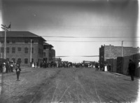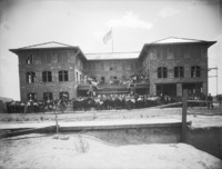 1928 A crowd gathered at the Hotel Perrine and along Main Ave, listening to speeches during Railroad Day. Flags and banners fly from the balcony of the Hotel, which is still under construction. (Description from Twin Falls News, 18 August 1905.)