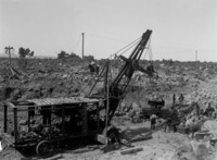 1923 Construction crews and a mobile crane, moving large boxes of rock in a canal bed.