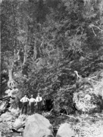 1882 Three men standing at the base of a steep incline covered with twisted trees.