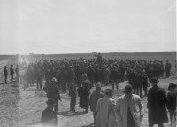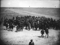 1885 A large group of men standing in a field; horses and/or cattle and a townsite in the distance.