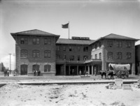 1889 Front view of the Hotel Perrine; Ezra Meeker, poses with his ox-team and wagon on his 1906 journey east along the original Oregon Trail.