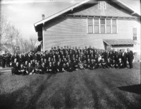 1819 Large group of mostly young people posed in front of the original First Christian Church.