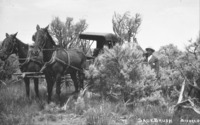 PC-2079 "Sagebrush;" a man standing amidst tall sagebrush, with a buggy and horses.
