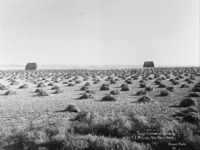 PC-2078 "Third Cutting of Alfalfa. C.E. McClain, Twin Falls, Idaho;" field with small piles of alfalfa. Two large stacks of hay/alfalfa in the background.