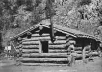 PC-2064 A log cabin situated at the base of a canyon wall