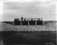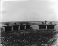 S 037 A man stands atop canal gates over a dray canal bed. A two-horse-buggy stands near the gates.