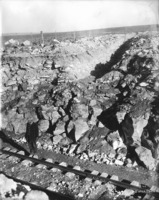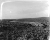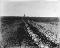 S 050 A man (possibly Clarence Bisbee) stands a a shallow, narrow dry canal channel.