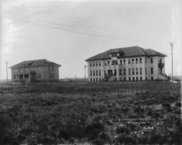 E 015 "State School for Deaf and Blind. Gooding, Idaho;" Two large stone buildings viewed from across a field. Students and other adults are posed on the steps of the larger buildings, while a group of men with wheelbarrows and other equipment work on the land between the buildings.