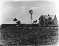E 017 "The Home of Dr. Henry, near Gooding, Idaho;" View of a two-story farm house, several outbuildings, and a windmill across a field. A man leads a team of horses at left.