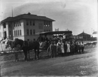 E 016 "School Days;" children posed on and in front of a school wagon on a street by school in Gooding. Houses are also visible in the background.