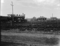E 003 "Experimental Farm, Gooding, Idaho;" a house and outbuildings in background, with a field divided by railroad tracks and fenced lanes. A man drives a flat-bed wagon pulled by two horses in front of the house; another man looks on from the yard, and a woman and child are seated on the house steps. A train, labeled as Idaho Southern Railroad sits on the tracks at the right, with several men on or near the cars.