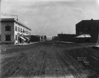 E 009 "Main Street, Gooding, Idaho;" view down an intersection with several buildings. Businesses visible include: a bank; hardware store; dry goods; The Toggery, Gent's Furnishings, Clothing, Shoes; Light and Power; a hotel; and the U.S. Post Office.