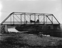 E 010 "The Big Wood River;" a bridge over the Big Wood River; one man stands on the bridge, while two men sit in a buggy driven by a team of horses.