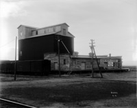 E 007 Gooding Milling and Elevator Company; a large grain elevator, warehouse, and train cars, near the railroad tracks.