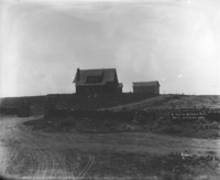 E 001 "A House of Lava Rock, Near Gooding, Idaho;" a house and barn sit on a small rise; a lava rock wall with gate in foreground.