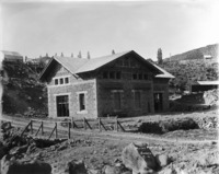 E 004 "Malad Power Site;" brick power station building on the Malad River, near Hagerman, Idaho. Several outbuildings and equipment are also visible.