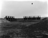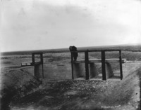 S 031 A man in a two-horse buggy stops on a berm beside a dry canal. Gates are in background.