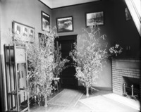 1699 Interior of Bisbee Studio. Ferns in vases and fireplace are visible.